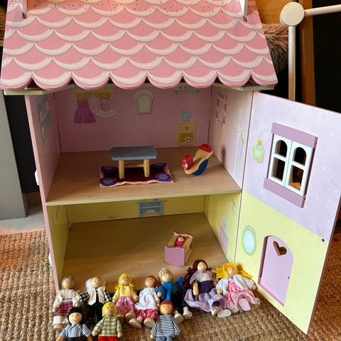 Selger et brukt dukkehus med møbler og familie. Fint brukt bortsett fra at ene toppen av huset har blitt knekt. Har blitt limet forsiktig sammen.