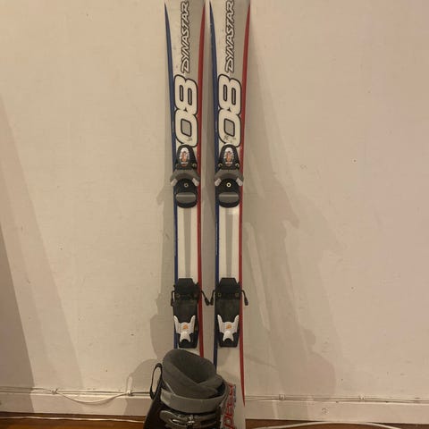 Rossignol Expe Jr alpinski på 130 cm med integrerte bindinger. Staver 90 cm.