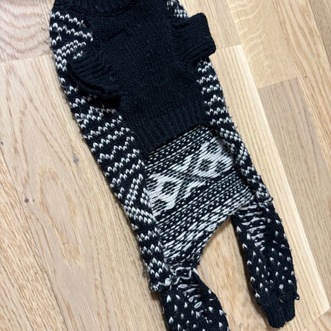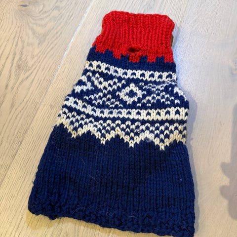 Strikket Marius hundegenser i ull med mønster i rødt, hvitt og blått. Genseren har høy hals og er formet for å passe kroppen på en liten thund. På bildene vises omtrentlige mål i lengde og bredde med målebånd. Egnet til bruk på kjølige dager for ekstra varme til hunden.