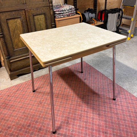 Gammelt retro kjøkkenbord. Typ 60/70-talls. Utdragbare sider, for å gjøre det større. Grei stand. Noen riper. Pris ferdig prutet. Må hentes i Horten