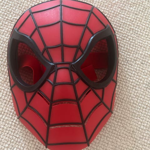 Speidermann Marvell maske der det i "hettemasken" er klippet hull til øyne i den hvite delen for øynene. Se bilder.