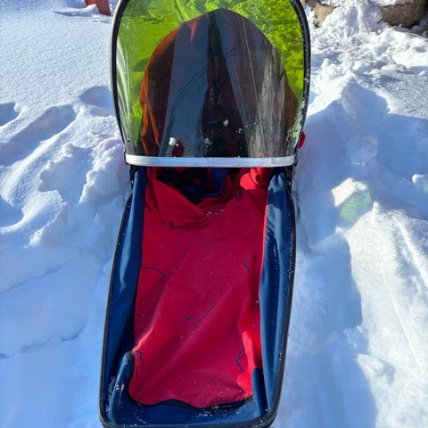 Fjellpulken barnepulk med drag og sele. Pulken har overbygg med vindskjerm og ligge-/sittepose. Medfølgende drag i metall og trekksele for voksen.