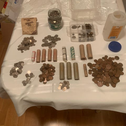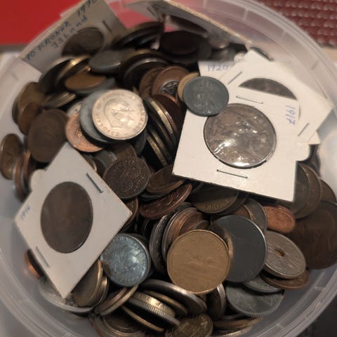 Totalt ca 8 kg mynter fordelt på: