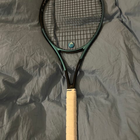 Tennisracket i svart med hvitt grep. Racketen har strenget hode og standard håndtak med overgrep. Egner seg til bruk på tennisbane for trening og spill. Passer for ungdom eller voksne avhengig av høyde og styrke.