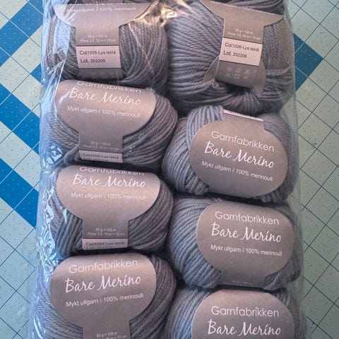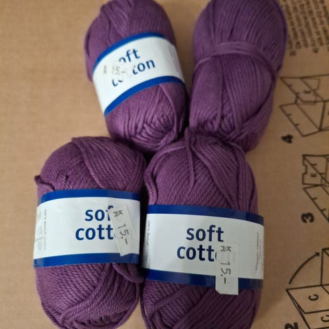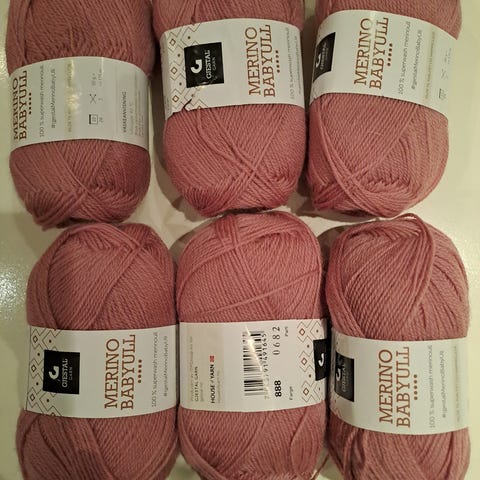 Garn i soft merino selges. 10 nøster 'a kr 30.