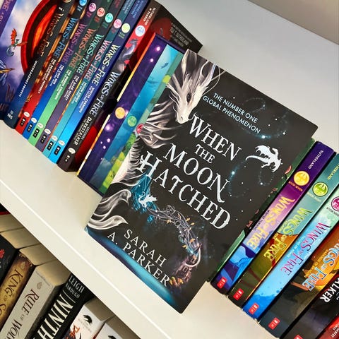 Sarah A. Parker When the Moon Hatched bok. Innbundet fantasyroman på engelsk. Boken har illustrasjoner i farger inne i boken. Passer for lesere som liker fantasy og romantiske elementer med drager og magiske verdener.