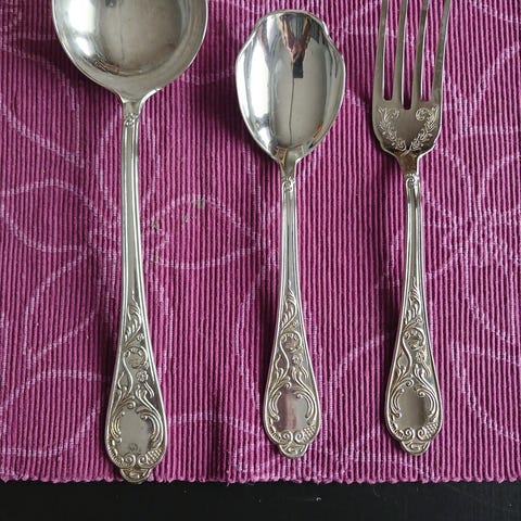 P. Hertz sølvbestikk sett. Bestikket består av flere serveringsdeler, blant annet skjeer og en gaffel. Delene har dekorert skaft i klassisk dansk stil. Egnet som serveringsbestikk eller supplement til eksisterende P. Hertz-sølvbestikk.