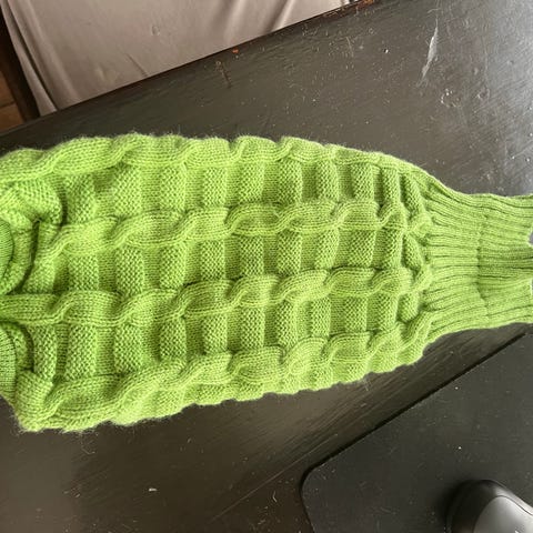 Hundegenser i strikket materiale med rutemønster i grå og rosa nyanser. Genseren har høy hals og åpninger til forben, samt snorer bak til feste rundt bakparten. Lengden på genseren er målt med målebånd på bildene, og bredden over brystet er også vist. Passer til mindre hunder som trenger et ekstra lag på kjølige dager. Egnet til bruk på tur eller innendørs for å gi hunden ekstra varme.