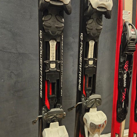 Alpinski med integrerte bindinger i fargene rød, svart og hvit. Skiene har tupp og bakski tilpasset alpint bruk i bakke. Bindingene er montert på skiene og har justerbar hæl- og tådel. Egnet for bruk i alpinbakke for generell skikjøring. Nøyaktig lengde, modellnavn og mål er ikke oppgitt.