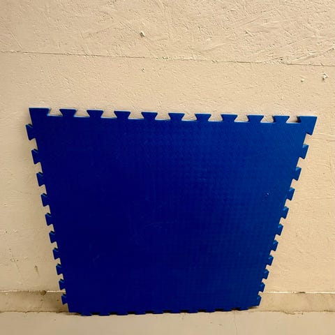 8 fliser på 60 x 60 cm. Ca 1 cm tykke. Treningsmatte i form av puslematter i blått skum. Består av flere kvadratiske matter som kan settes sammen til ønsket størrelse og form. Kantene har puslefasong slik at bitene låses til hverandre. Egnet som underlag til trening, lek eller som beskyttelse av gulv. Materiale: skumplast. Farge: blå.