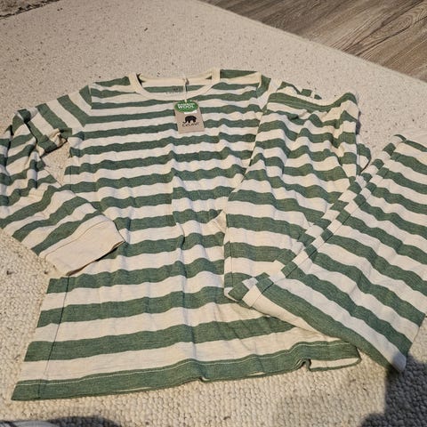 CeLaVi ullsett til barn i størrelse 130 (7-8 år står det inni). Settet består av langermet genser og bukse. Genseren har rund hals og motiv av bil foran. Buksen har strikk i livet og ribb nederst på bena. Ull på utsiden og bambus på innsiden.