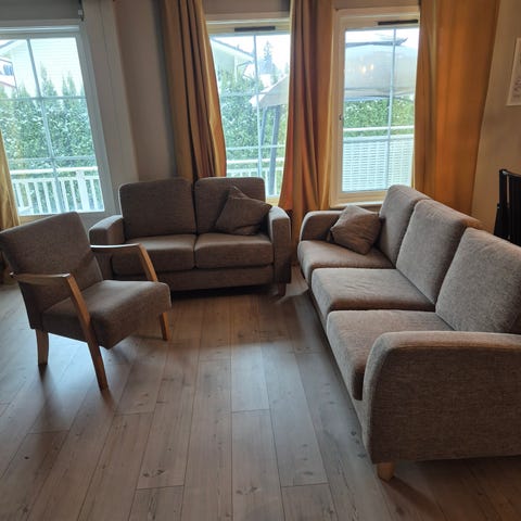 Selger hel å fin sofagruppe. 3 seter og 2 lounge stoler. Kan evt avtale levering mot et lite tillegg, i Trondheims området.