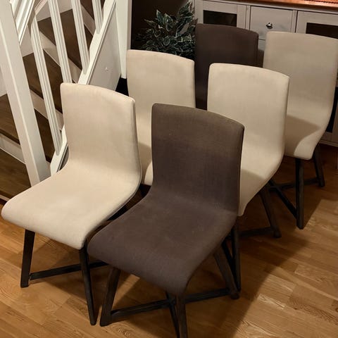 Overflaten er slitt, men hvis de trekkes om har du helt supre stoler. Må hentes samlet