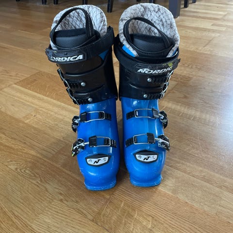 Nordica GP alpinstøvler i blå plast med svarte og gule detaljer. Støvlene har fire justerbare spenner og powerstrap øverst for bedre tilpasning rundt leggen. Sålelengde er merket 278 mm og skostørrelse 230–235. Innvendig fôr gir isolasjon og komfort. Egnet til bruk i alpinanlegg med standard alpinbindinger.