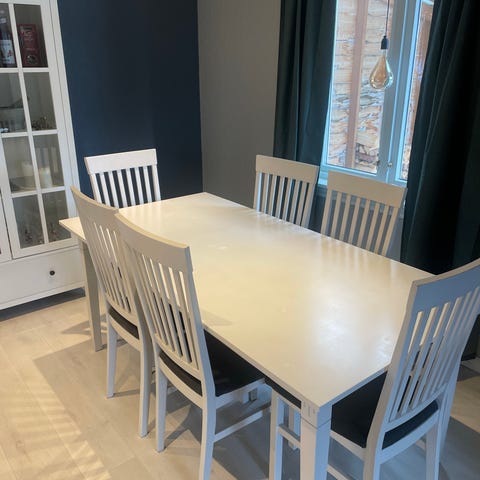Flott spisebord fra Møbelringen ny pris 12000kr, et hakk i siden viser ikke på oppsiden av bordet, ellers fint 180x95 pluss to klaffer på 45 cm, selges uten stoler😊