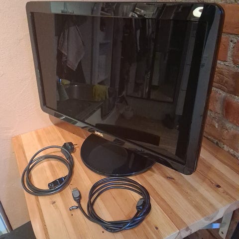 Skjermen har HDMI- og VGA-inngang på baksiden. Den står på en rund fot og leveres med strømadapter som vist på bildene. Egner seg til bruk med stasjonær PC, bærbar PC eller andre enheter.