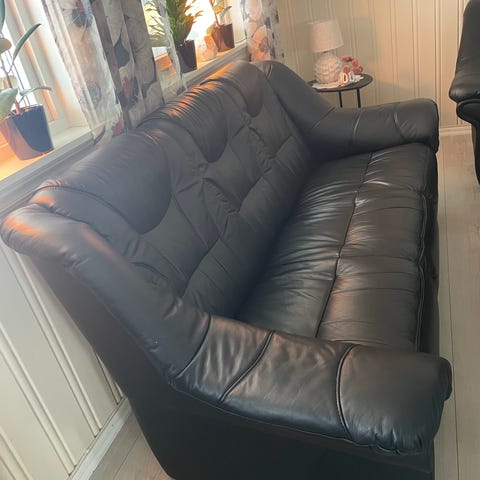 Stilig 3-seters skinnsofa i sort med røde detaljer
