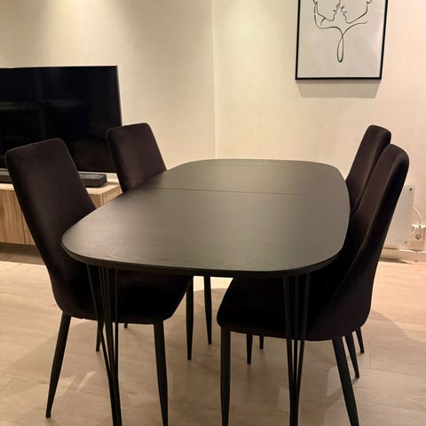 Skala spisebord frå Haslev Møbelsnedkeri i Danmark. Ø 120 pluss 1 ileggsplate på 50 cm. Farge grafit. Kjøpt på Bohus i vår. Ny pris ca 25000.