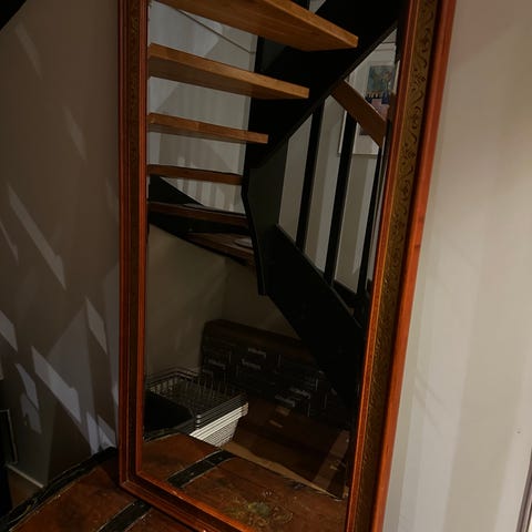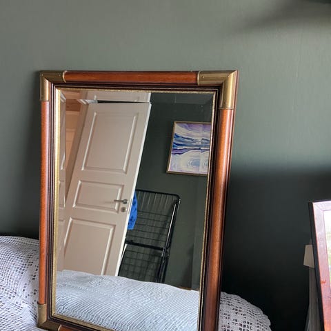 Speil med treramme. Rektangulært speil med markert ramme i tre med patinert overflate. Kan brukes stående på gulv eller henges på vegg i stue, gang, soverom eller andre rom der man ønsker et funksjonelt speil med tydelig ramme.