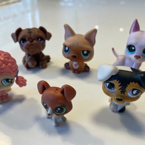Littlest Pet Shop lekefigurer sett. Inneholder flere små dyrefigurer, blant annet katter, hund og en sneglefigur, samt en større myk kosedyrfigur. Egnet til rollelek og samling for barn som liker Littlest Pet Shop-universet.