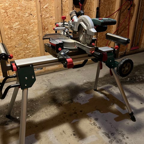 Kapp- og gjærsag montert på sammenleggbart sagbord. Sagen har justerbart anlegg og uttrekk for lengre emner. Sagbordet har støttearmer på begge sider for bedre støtte ved kapping av lengre materialer. Egnet til trearbeid som kapping av lister, plank og andre treemner i verksted eller på byggeplass.
