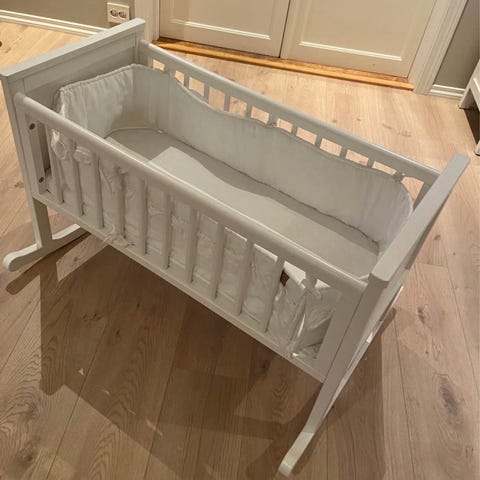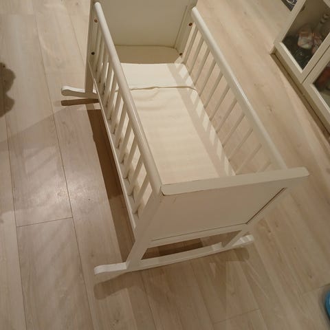 Troll vugge i tre med hvit ramme og bunn i naturfarget tre. Bruksmerker som en kan se på bildene.