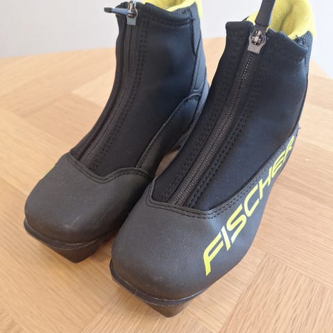 Fischer langrennsstøvler i svart med gule detaljer. Støvlene har glidelås i front. Størrelse 34.