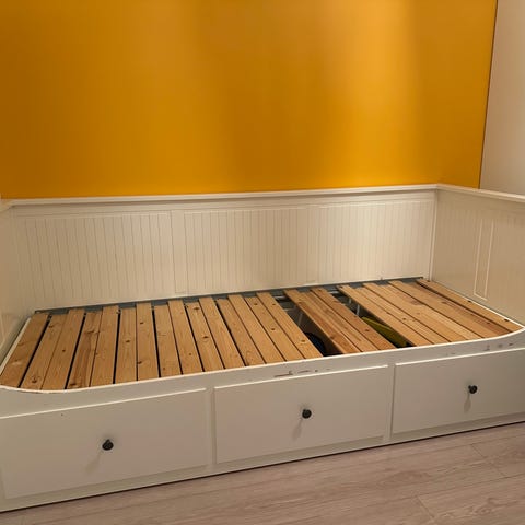 IKEA dagseng med tre skuffer i grå utførelse. Sengen har rygg- og sidepaneler som gjør at den kan brukes som sofa på dagtid og seng om natten. Underdelen består av tre romslige skuffer som gir ekstra oppbevaringsplass til sengetøy eller annet utstyr. Ribbebunnen gir støtte til madrass og bidrar til ventilasjon. Passer i soverom, gjesterom eller barnerom der det er behov for både sitte- og soveplass samt oppbevaring.