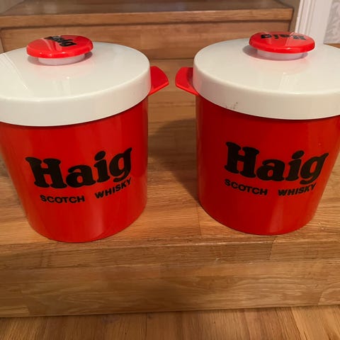 isbøtte i rød og hvit plast. Beholderen har hvitt lokk med håndtak/åpning i toppen og rød utside med trykk. Egnet til oppbevaring og servering av isbiter ved borddekking og servering av drikke. Kan brukes på kjøkken, barvogn eller ved selskap og sammenkomster.