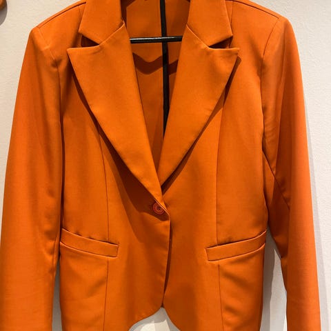 InWear Abra blazer og Abra bukse for dame i størrelse 36. Sett i oransje farge. Blazeren er dobbeltspent med slag og lommer i front. Buksen er vid med høyt liv og legg foran. Egnet som dressett til hverdags- og penbruk.