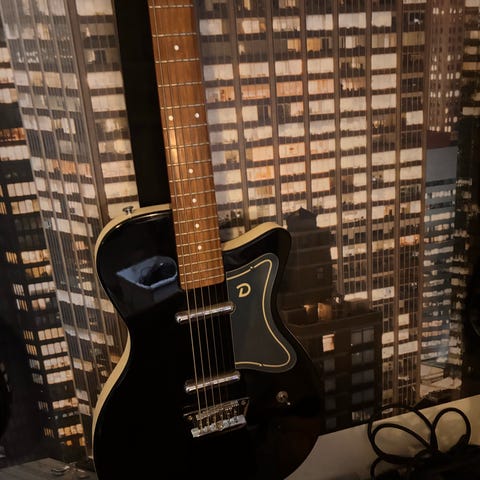Kul bariton gitar med behov for litt kjærleik fra den som kan eller kjenner noen som kan. Skurrer greit på D-strengen løs, ellers fungerer den fint «fretted»