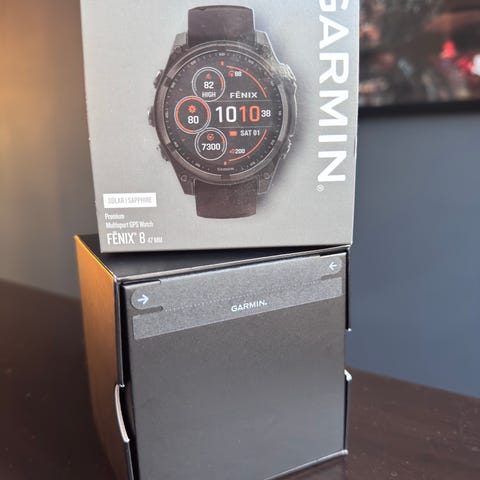 Selger en meget robust og velholdt Garmin Fenix 7X Sapphire Solar Titanium. Dette er den største og mest påkostede utgaven av 7-serien, med ripesikkert safirglass, solcellelading for ekstrem batteritid og urkasse i lettvekts-titan.