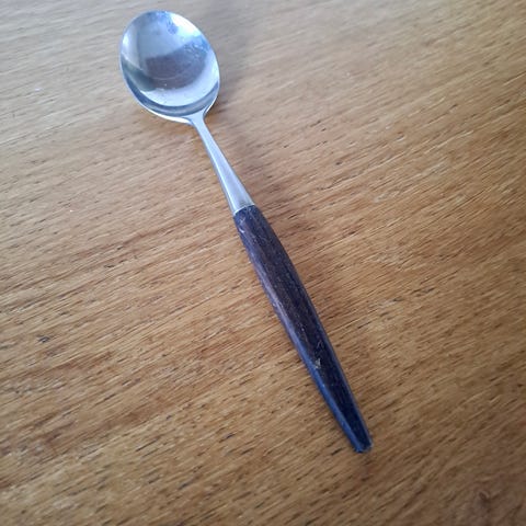 Åtte vintage norskproduserte skjeer fra Helle. Fem litt mindre, type barneskje/ dessertskje og tre spiseskjeer. De har litt varierende slitasje på plastskaftene og en av barneskjeene er mørkere i metallet. Ellers god stand med forventede bruksspor. Ikke alle er merket.