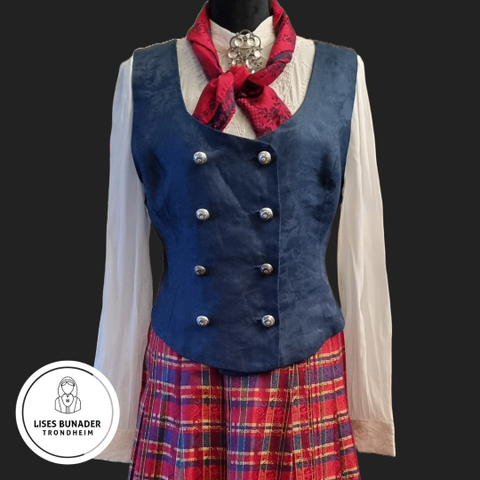 Unik festdrakt fra kjente og bokaktuelle Lisbeth Bjørndal. Dette er redesign og gjenbruk på høyeste nivå og i ypperlig kvalitet. Fantasistakken er unik, og det eksisterer kun dette eksemplaret. Helt nydelig festdrakt med vintage broderier og sydd av ullstoff, bomullsbrokade og flotte bånd. Livet er foret med baskerlin og dekorert med perler og annen pynt. Forkleet er av thaisilke. Beltet lukkes med borrelås. Den flotte vesken og bomullsskjorte med blå roser følger med. Overvidde er 98 cm, livvidde er 78 cm, skjørtelengde er 100 cm, rygglengde 33 cm og hel lengde fra skulder og ned er 142 cm. Kan utvides med tilsammen 9 cm eller sys inn. Et helt nytt silkeskjerf fra Tyrihans som matcher fargene i drakten perfekt kan kjøpes med for kr 850. Selve drakten selges for kr. 6000. Den er brukt kun en gang, 17. mai i fjor, og jeg kjøpte den ny i mars i fjor for kr.7500. Kom gjerne og se på den og prøv.