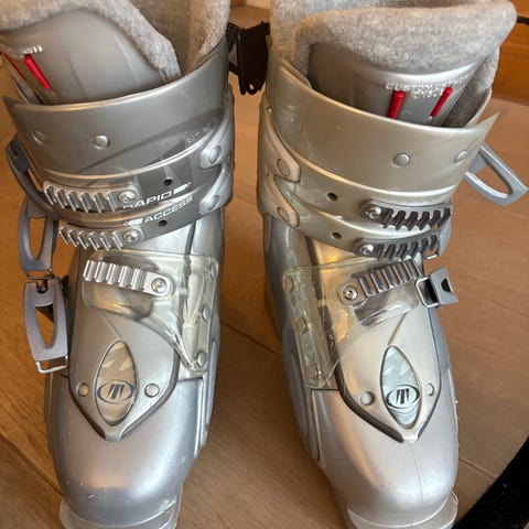 Head alpinstøvler i sølv og rød med flere justerbare spenner og powerstrap øverst. Str. 230-235 (ca.36-38)