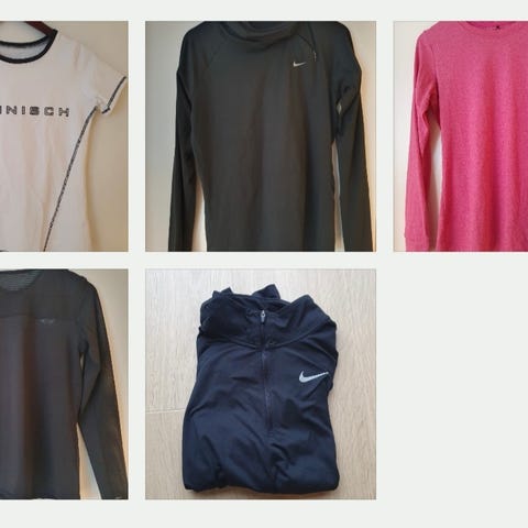 Pakke med 7 treningsgensere (fra Nike, Röhnisch, Adidas og Casall) og en treningsjakke (Nike). Litt forskjellige størrelser, men de alle passer en small. Veldig pent brukt.