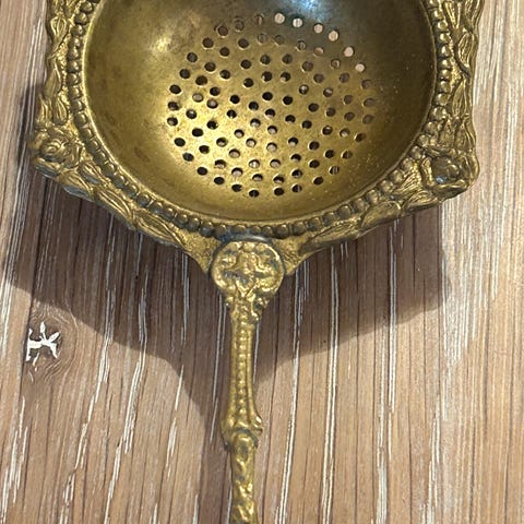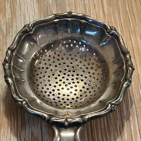 Tesil i metall med langt håndtak. Silen har små hull i bunnen og en dekorert kant rundt. Egnet til å sile løs te direkte over kopp eller kanne. Metalloverflaten har synlige bruksspor og patina.