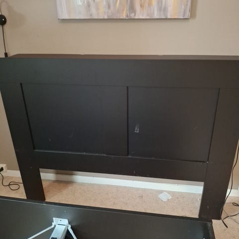 Hvit sengegavl med oppbevaring. Er demontert - enkel å frakte, alt av skruer og monteringsanvisning medfølger selvfølgelig.