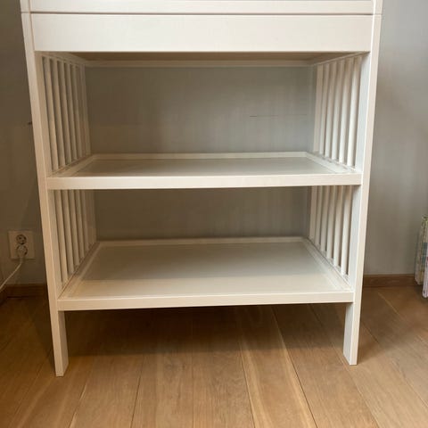 IKEA stellebord i hvit utførelse. Stellebordet har kant rundt stelleflaten og to åpne hyller under til oppbevaring av bleier, klær og annet utstyr. Laget i tre og plate-materiale med sprosser på sidene. Noe slitasje og merker i overflate og kanter, se bilder for detaljert tilstand.
