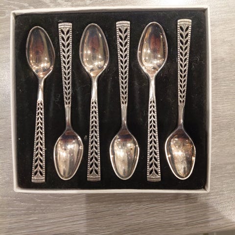 Dette er sølvskjeer i mønsteret "Juvel", designet av John Gulbrandsrød i 1965.