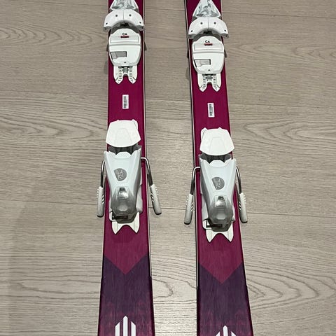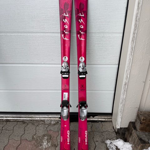 Head alpinski med integrerte bindinger i justerbar lengde. Skiene har et rosa design med hvite og svarte bindinger. Sålen er hel og har normal bruksslitasje.