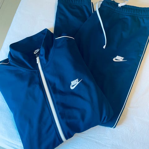 Nike treningsdress for barn i størrelse 164. Sett med jakke og bukse i blå farge. Jakken har glidelås i front, høy krage og lange ermer. Buksen har strikk i livet og rette ben. Passer til ulike typer fysisk aktivitet og fritidsbruk. Str:158-164.