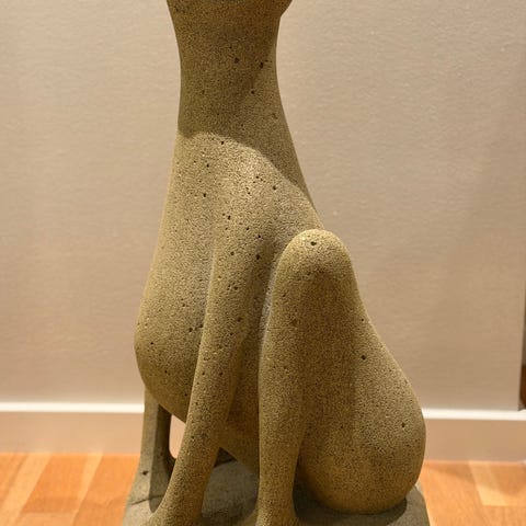 Hundefigur skulptur i mørk farge. Forestiller en sittende hund på sokkel, med slitt overflate og lyse partier som gir et rustikt preg. Passer som dekorasjon innendørs, for eksempel i gang, stue eller på et annet sted der man ønsker en figur som interiørdetalj. Materialet fremstår som støpt og massivt. Figuren er detaljert utformet med tydelige konturer av kropp, poter og hode, og vises fra flere vinkler på bildene.