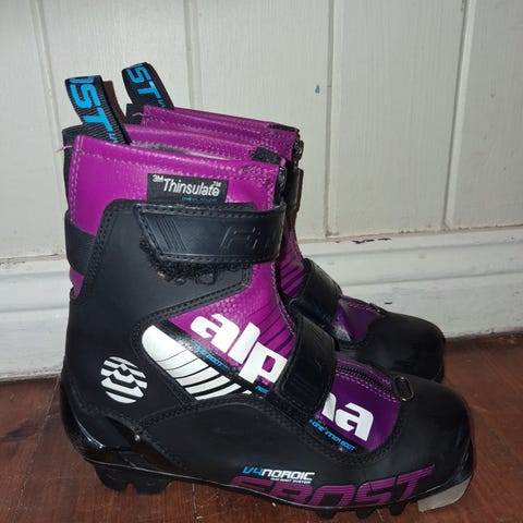 Alpina barne skisko i rosa og svart med to borrelåsstropper og høy ankelstøtte. Skoene har varm, pelsfôret innersko som kan brukes som tøffel.