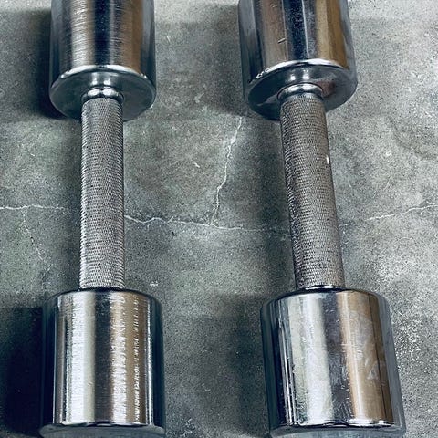 De er brukt men i god funksjonell stand. Dette er kommersielle hantler ment for treningssenter, de er laget for å tåle dropp og røff og mye bruk