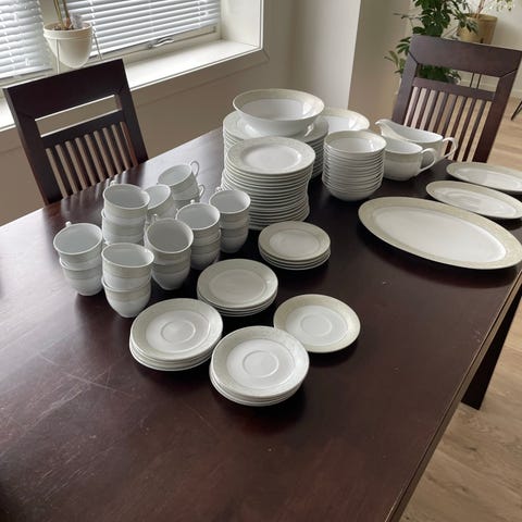 Komplett servise i hvitt med diskret mønster, pent brukt og i veldig god stand.