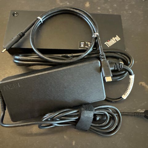 Lenovo ThinkPad dokkingstasjon med USB-C-tilkobling og medfølgende strømforsyning.