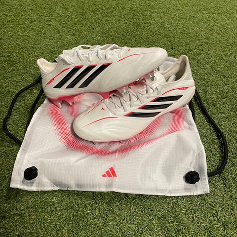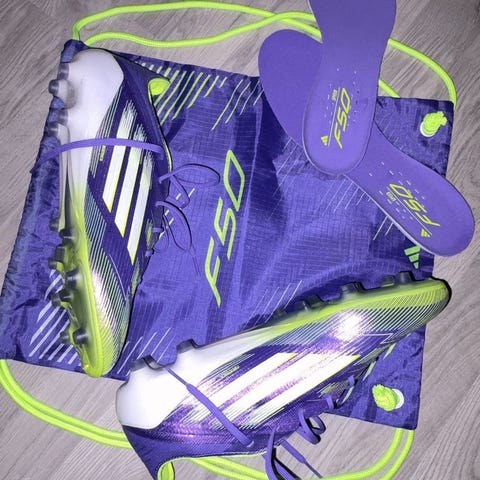 Adidas X Speedflow fotballsko i hvit, lilla og gul farge. Skoene har knottesåle til bruk på kunstgress baner.