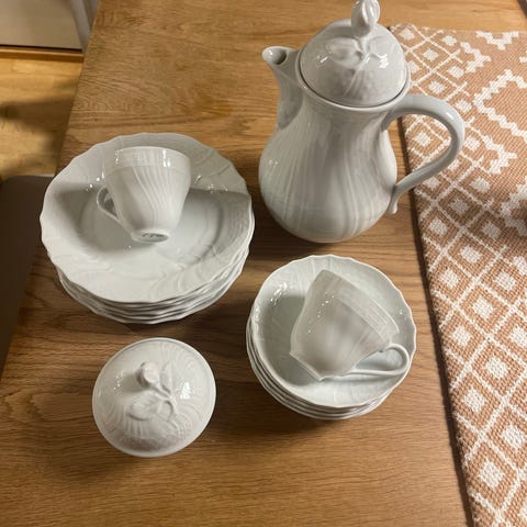 12 tallerkner, 10 tefat, 5 kopper og en sukkerskål med lokk.