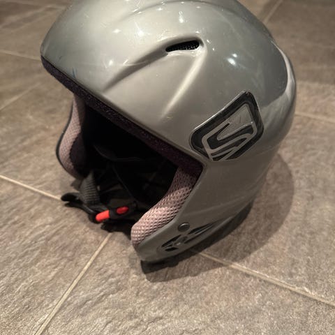 størrelse S med justeringsmuligheter. Hjelm har ventilasjonsåpninger på toppen og feste bak for skibriller.